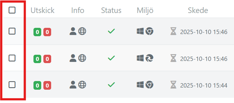 För att radera en eller flera respondenter klickar du i checkboxen som är längst till vänster i respondenttabellen. Du kan även klicka på checkboxen i rubrikraden för att markera/avmarkera alla respondenter på aktuell sida.