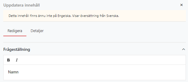 - Redigera innehåll. När ett innehåll saknar översättning får du en notis i editorn om att originalspråket visas. Öppna innehållet och skriv in översättningen