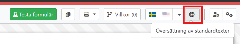 Utöver dina egna texter kan du översätta “standardtexter”, som t.ex. texter på navigationsknappar och tacksida, via knappen Översättning av standardtexter: