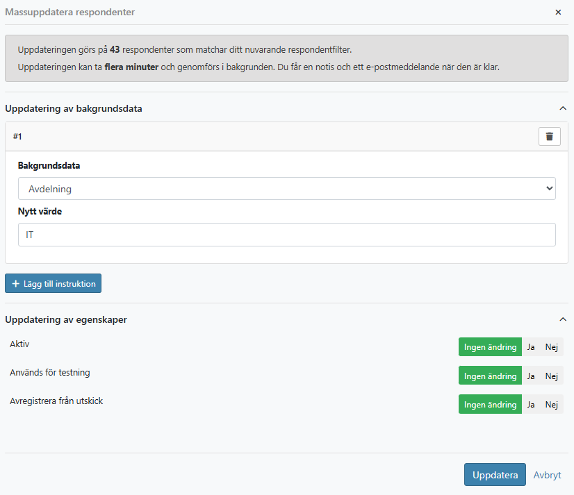 I exemplet ovan uppdateras bakgrundsfältet Avdelning till värdet IT för samtliga respondenter som matchar det aktiva filter. Antalet berörda respondenter visas innan uppdateringen bekräftas, vilket minskar risken för ändringar av fel grupp respondenter.